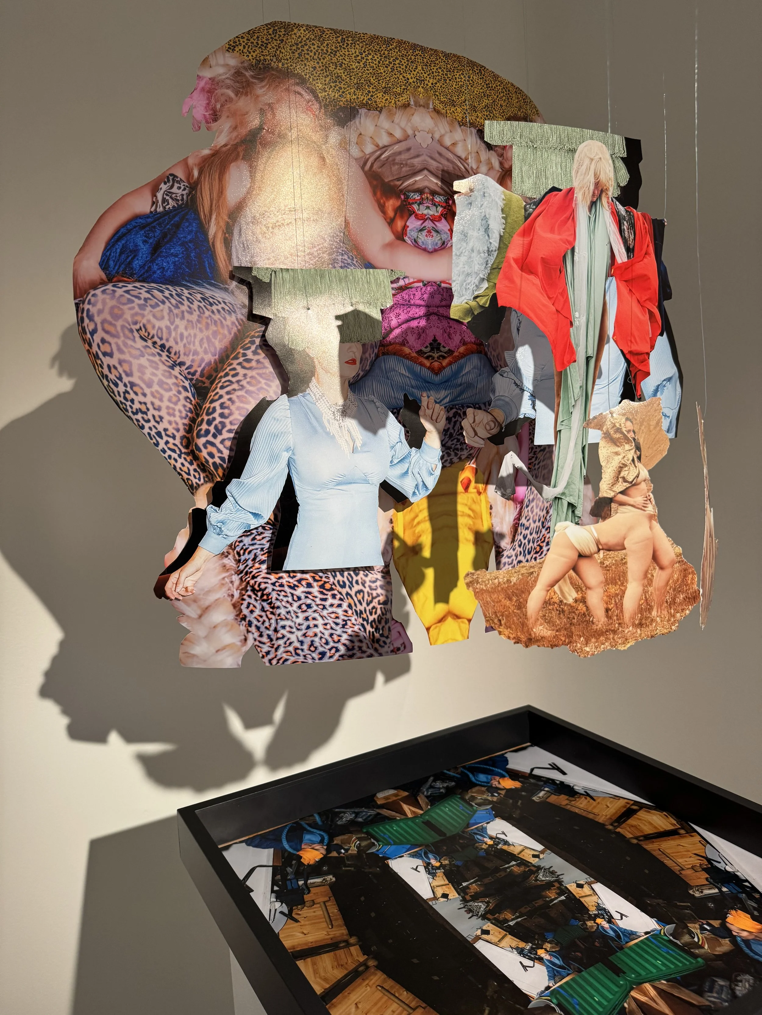 Her work is a photo collage cut and pasted together on paper or in an image-editing programme. The processing and finishing of Telmas's art show the viewer, at first glance, a glam version of the subject. Still, upon closer inspection, her work contains everyday objects such as hairpins, tights, or toys. Telmas's collages provide a good insight into her work as an artist, as she only uses photos, she has shot herself.